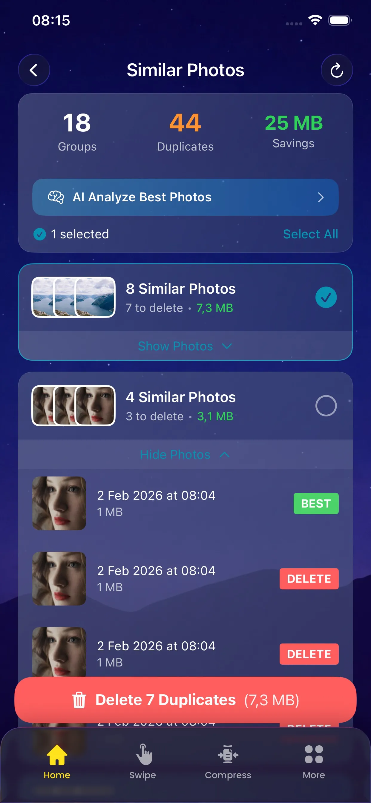 Scan 5 features at once with one tap. Find similar photos, screenshots, bursts, and more in seconds.