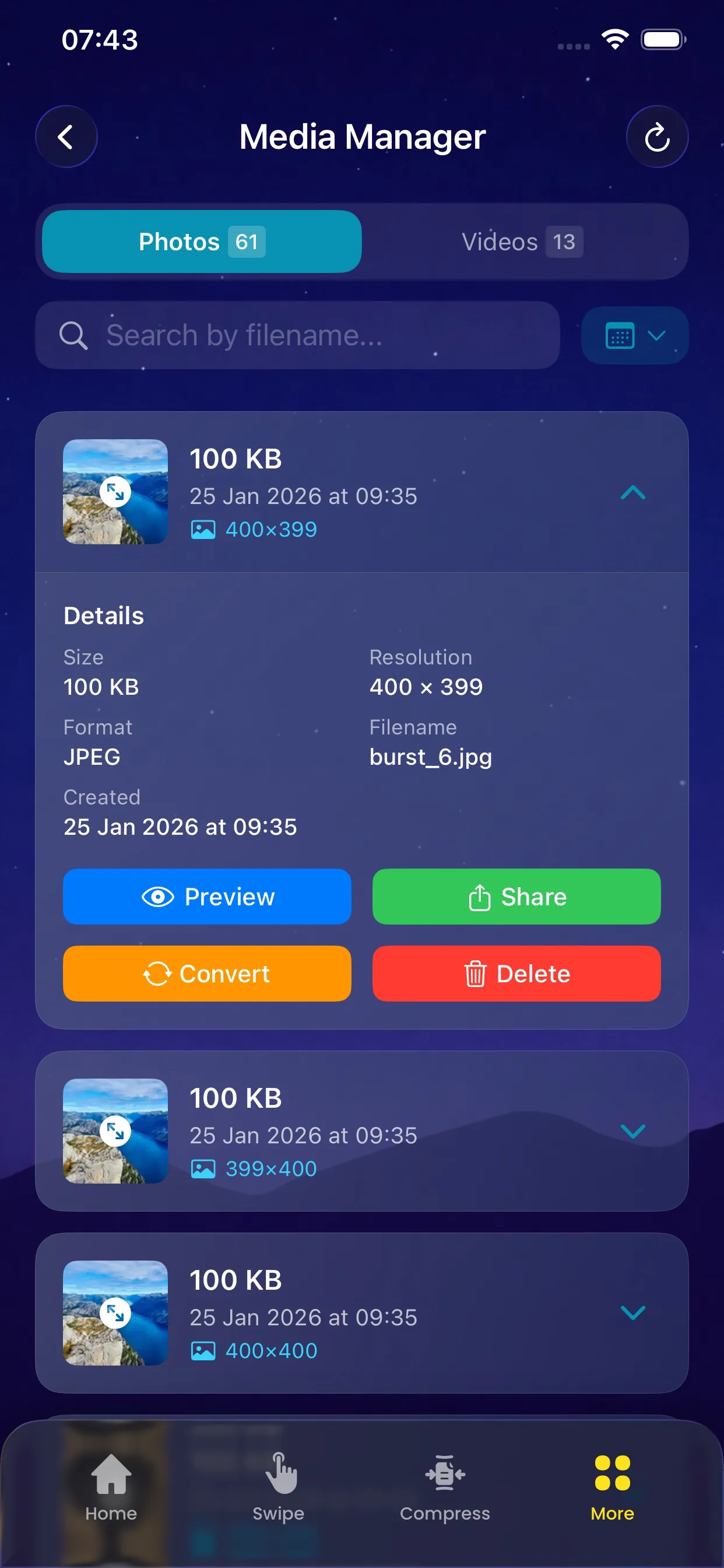Swipe through results to quickly review. Decide which items you want to keep or remove.